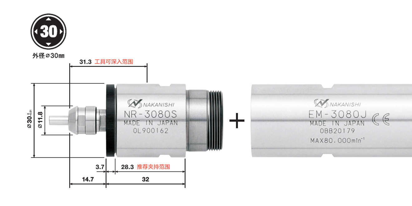 | NR-3080S | 7876 | φ30 mm | 80000 min-1 | 1μm以內 | CHA系列(φ0.5~φ4.0mm) | 170g |
