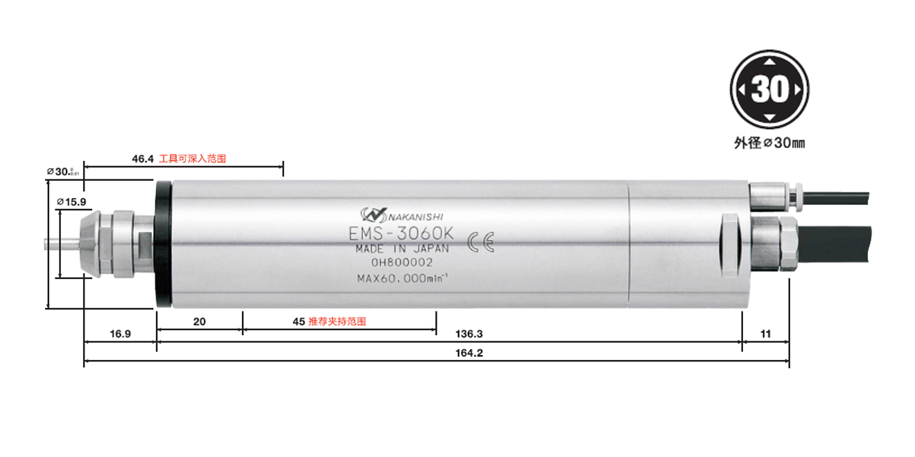| EMS-3060K | 7862 | φ30 mm | 60000 min-1 | 1μm以內 | CHK系列(φ0.5~φ6.35mm) | 350W | 565g |