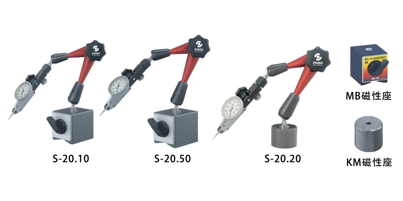 S-20F僅為萬向關節臂(F表示帶微調裝置);S-20F+S+TM表示萬向關節臂加上代號為S的鋼制柱體(φ8mm高50mm,訂貨編號為5.460),TM表示底座是罐形永磁體