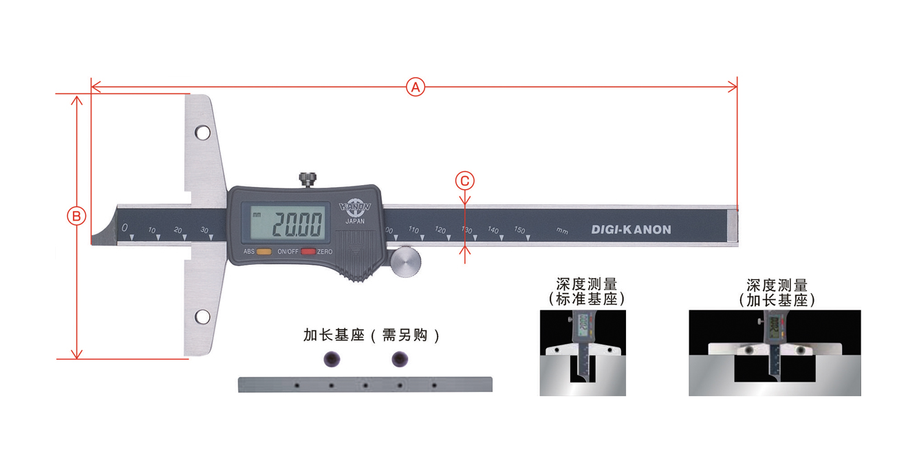 • 由于基座尺寸可變,可用于在正常深度測量,也可安裝更換成加長基座,對更大孔深度測量